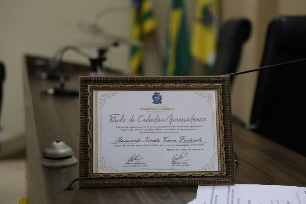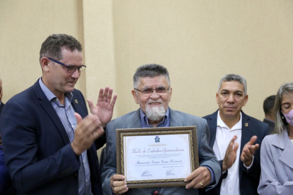 Nesta quarta-feira, 23, foi realizada sessão solene para entrega de título de cidadão aparecidense ao Senhor Raimundo Nonato Vieira Fontenele, em reconhecimento aos seus relevantes serviços prestados ao município. A propositura foi do vereador Elio Bom Sucesso.