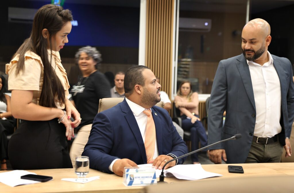 Câmara Municipal de Aparecida de Goiânia, 15/04/2025. Em Sessão Ordinária realizada na manhã desta terça-feira, 15, os vereadores de Aparecida aprovaram a concessão de quatro títulos de Cidadão Aparecidense em reconhecimento aos relevantes serviços prestados ao município. Entre os homenageados estão o deputado federal Nikolas Ferreira e a primeira-dama de Aparecida, Lana Bezerra, ambos por meio de projeto de autoria do vereador Dieyme Vasconcelos.