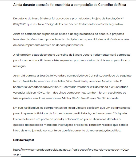 Câmara de Aparecida aprova Código de Ética e Decoro Parlamentar