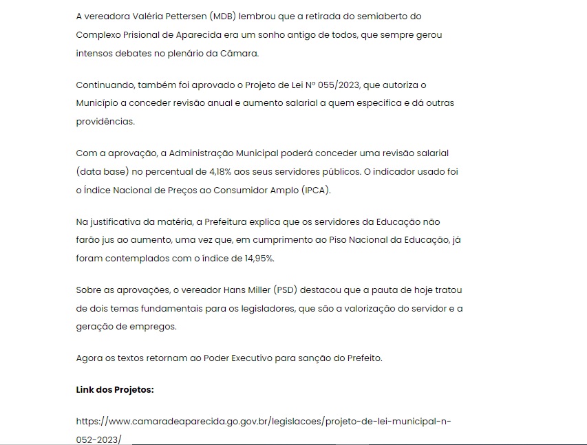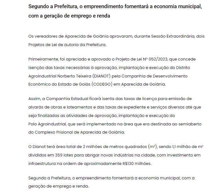 Câmara de Aparecida aprova isenção para novo Polo Agroindustrial do semi-aberto