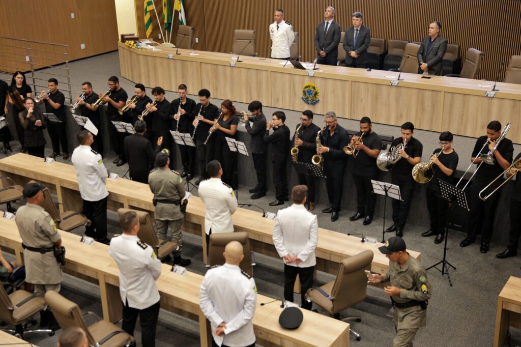 Câmara Municipal de Aparecida de Goiânia, 30/04/2025. Por iniciativa do vereador Cristiano Zoi, a Câmara Municipal de Aparecida de Goiânia realizou, na noite de ontem, 29, sessão solene para homenagear 18 militares da Polícia Militar e do Corpo de Bombeiros do Estado de Goiás com a entrega do título de Cidadão Aparecidense. A honraria reconhece a dedicação desses profissionais à segurança pública e ao desenvolvimento do município.