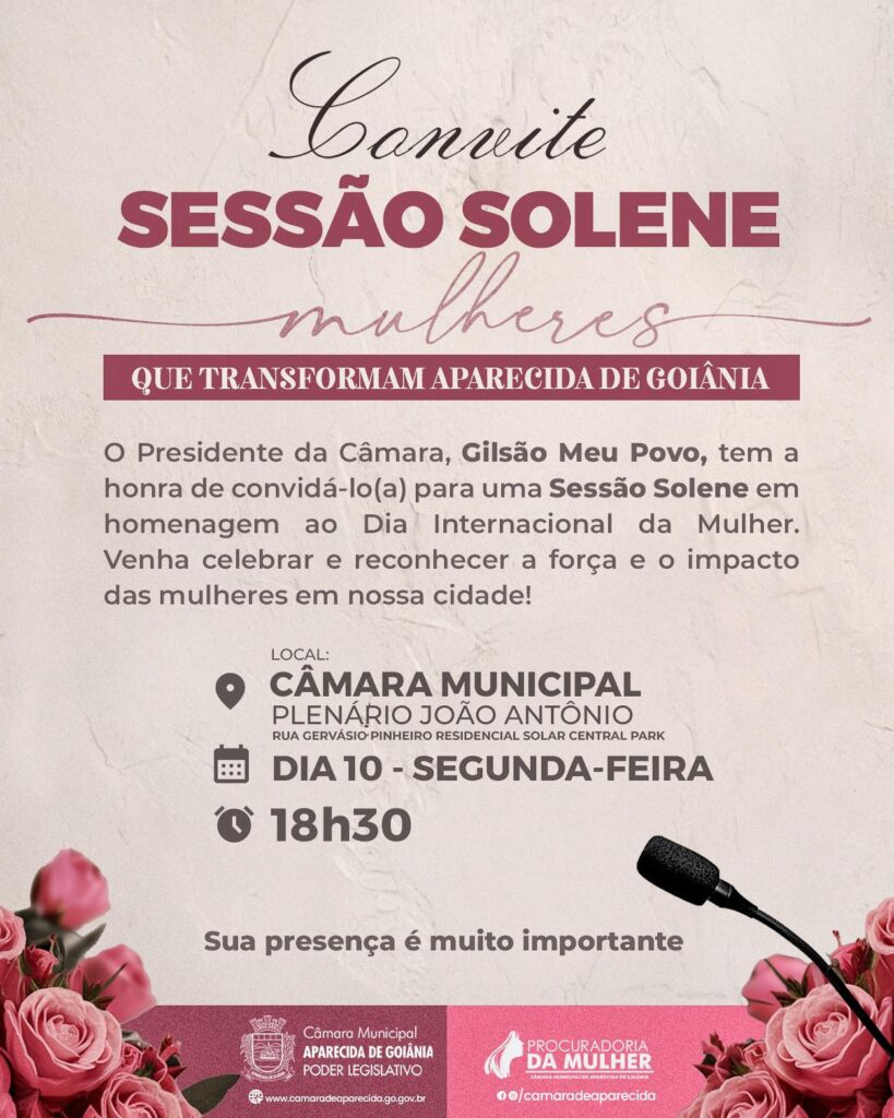 - 18h30 (Plenário João Antônio) – Sessão Solene: “Mulheres que transformam Aparecida de Goiânia”.