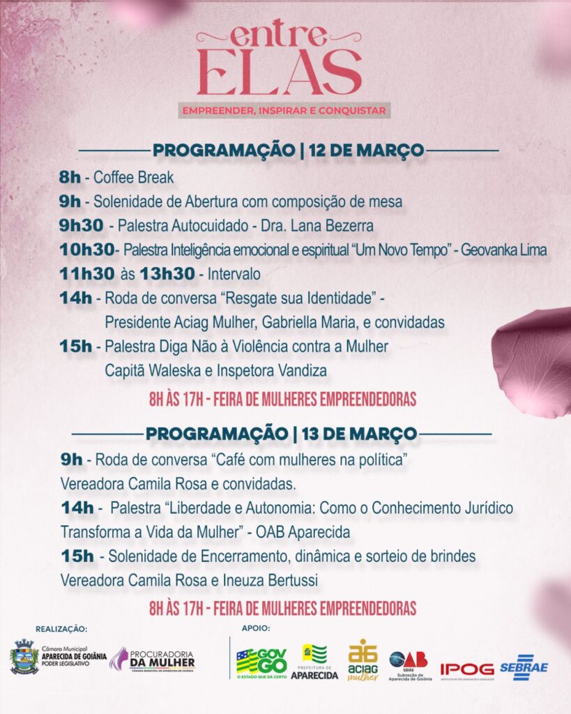 Dando continuidade às atividades, nos dias 12 e 13, das 8h às 17h, será realizado o evento “Entre Elas – Empreender, Inspirar e Conquistar”, promovido pela Procuradoria da Mulher e representado por sua Procuradora, a vereadora Camila Rosa. A programação contará com uma feira de serviços, palestras, rodas de conversa e distribuição de brindes.