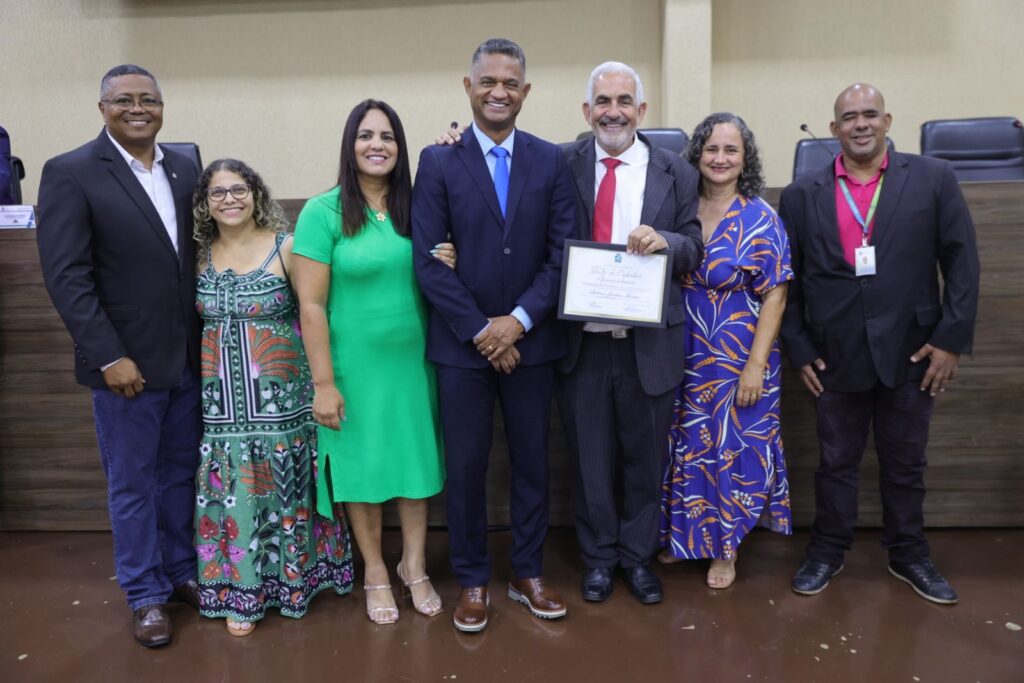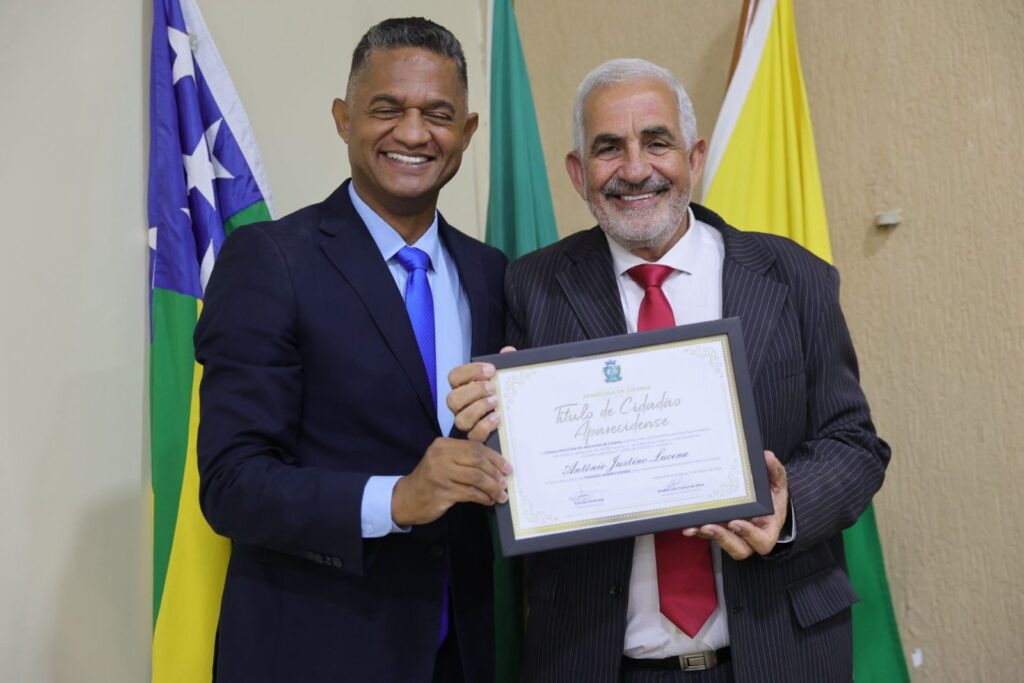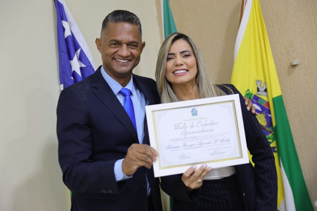 Câmara Municipal de Aparecida de Goiânia, 12/3/2024. Em Sessão Solene realizada na noite de ontem, 11, a Câmara de Aparecida de Goiânia conferiu o título honorífico de Cidadão Aparecidense ao senhor Antônio Justino Lucena e à senhora Silvana Borges Azevedo D’Avila. A homenagem, proposta pelo vereador Getúlio Andrade através dos Decretos Legislativos Nºs 251/24 e 252/24, foi um reconhecimento aos serviços prestados por ambos ao município.
