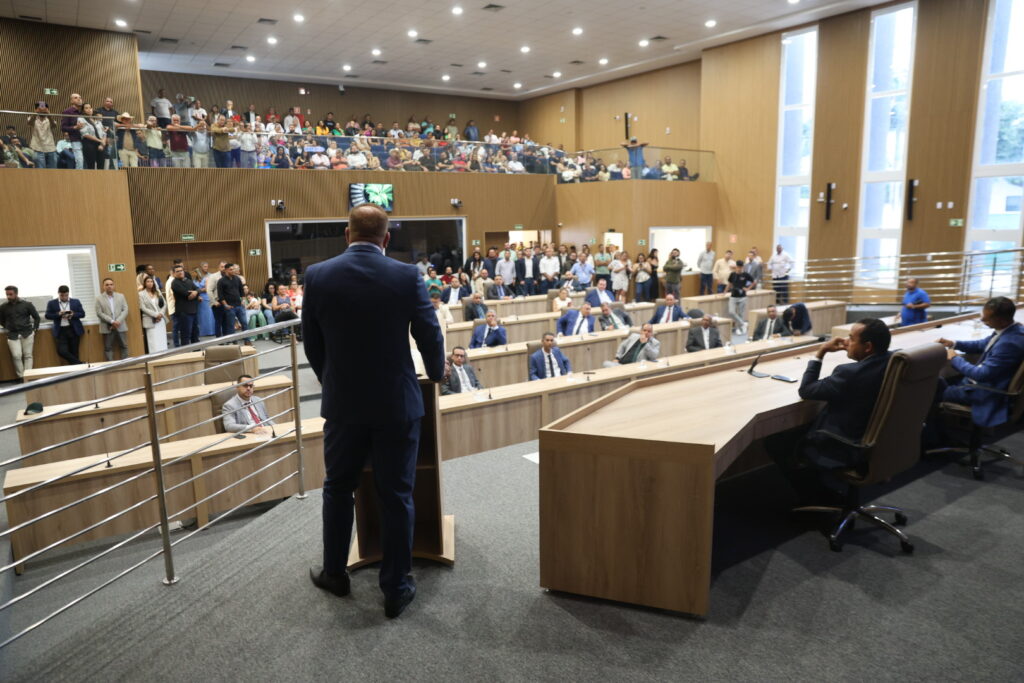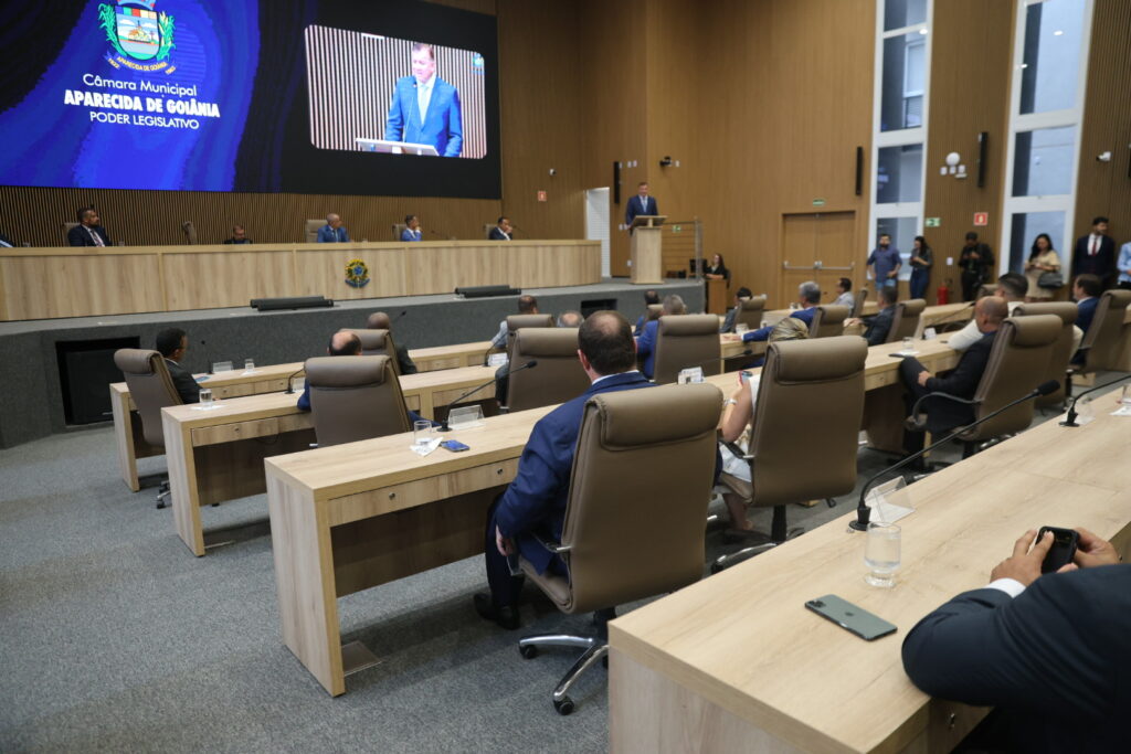 Câmara Municipal de Aparecida de Goiânia, 01/01/2025. Logo após a cerimônia de posse do Prefeito Leandro Vilela, do Vice-prefeito João Campos e de todos os vereadores, a Câmara Municipal de Aparecida de Goiânia realizou a eleição para a nova Mesa Diretora, que conduzirá os trabalhos durante o biênio 2025/2026.