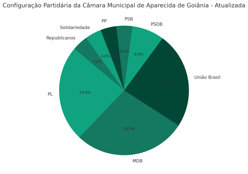 Câmara Municipal de Aparecida de Goiânia, 8/4/2024. Após o encerramento do período conhecido como janela partidária, a Câmara de Aparecida de Goiânia apresenta uma nova configuração partidária de seus vereadores, com partidos como o MDB, União Brasil e PL como as siglas com mais representantes. Durante essa fase, os parlamentares tinham a oportunidade de alterar suas afiliações partidárias sem o risco de perderem seus mandatos por infidelidade partidária. Além disso, as mudanças nesse momento refletem estratégias políticas e alianças projetando as próximas eleições.