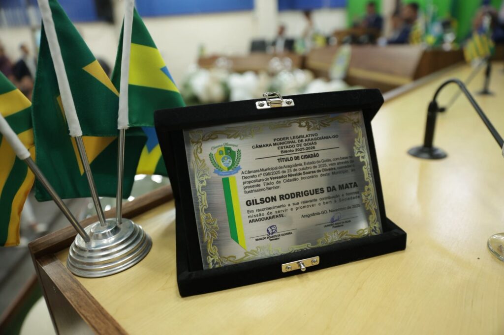 Câmara Municipal de Aparecida de Goiânia, 26/11/2025. Na noite de ontem, 25, o presidente da Câmara de Aparecida, vereador Gilsão Meu Povo, foi homenageado pela Câmara de Aragoiânia ao receber o título de cidadão honorário do município, por propositura do vereador Nivaldo Soares de Oliveira. A honraria reconhece sua relevante contribuição e sua atuação dedicada ao serviço público e ao bem-estar da comunidade.