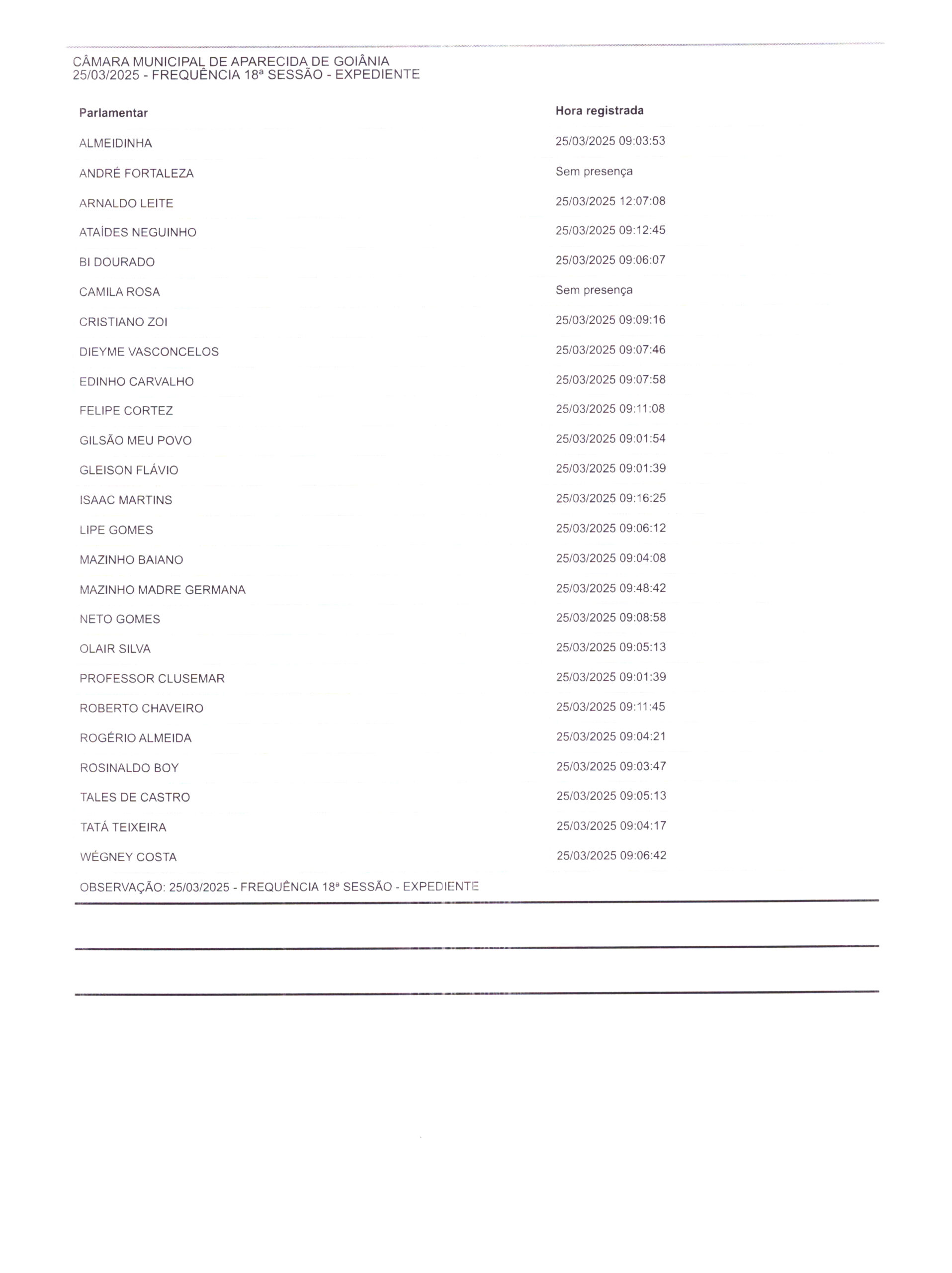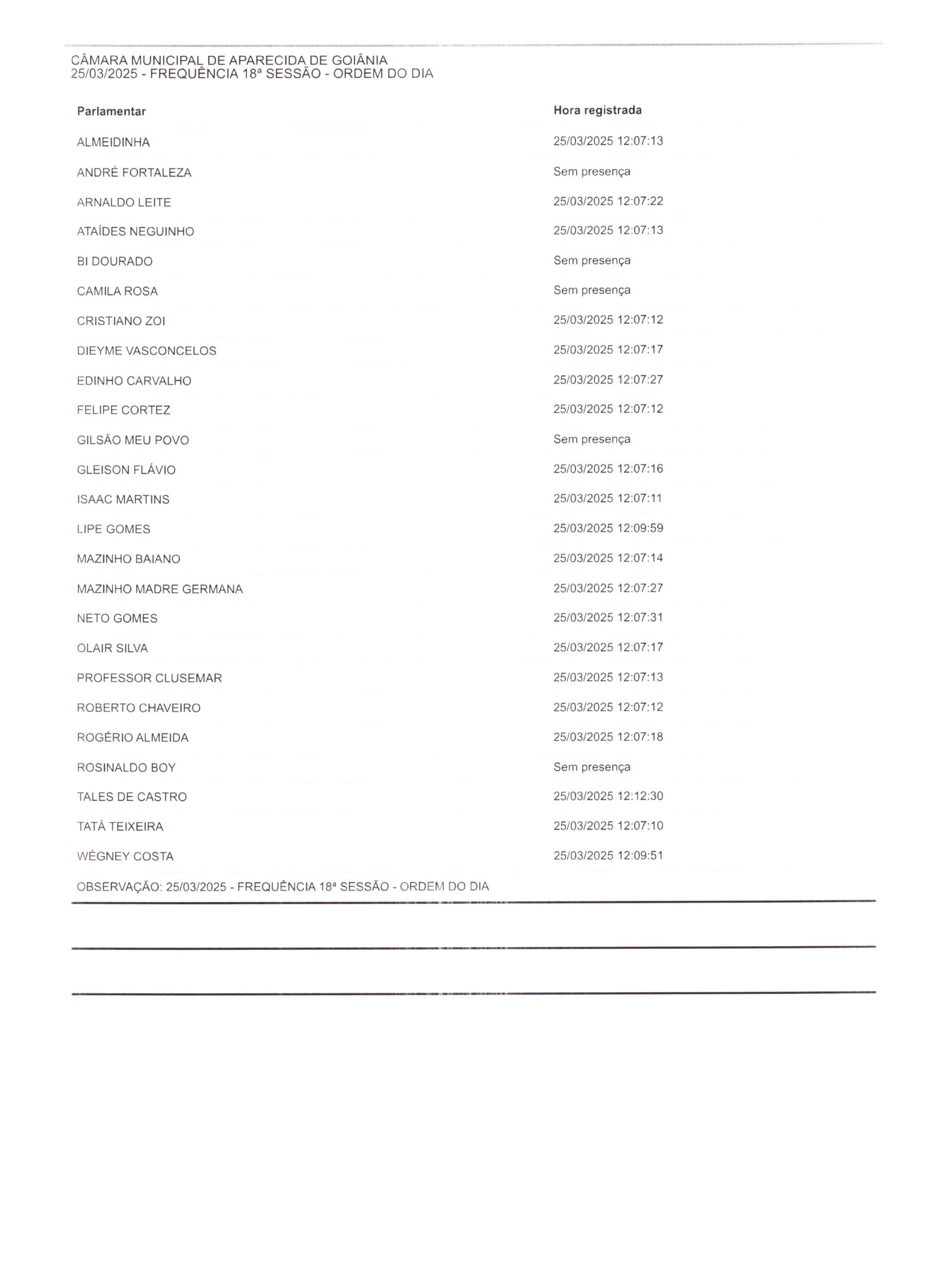 Ata em forma de resumo e frequência: Ata da Décima Oitava Sessão Ordinária de 2025