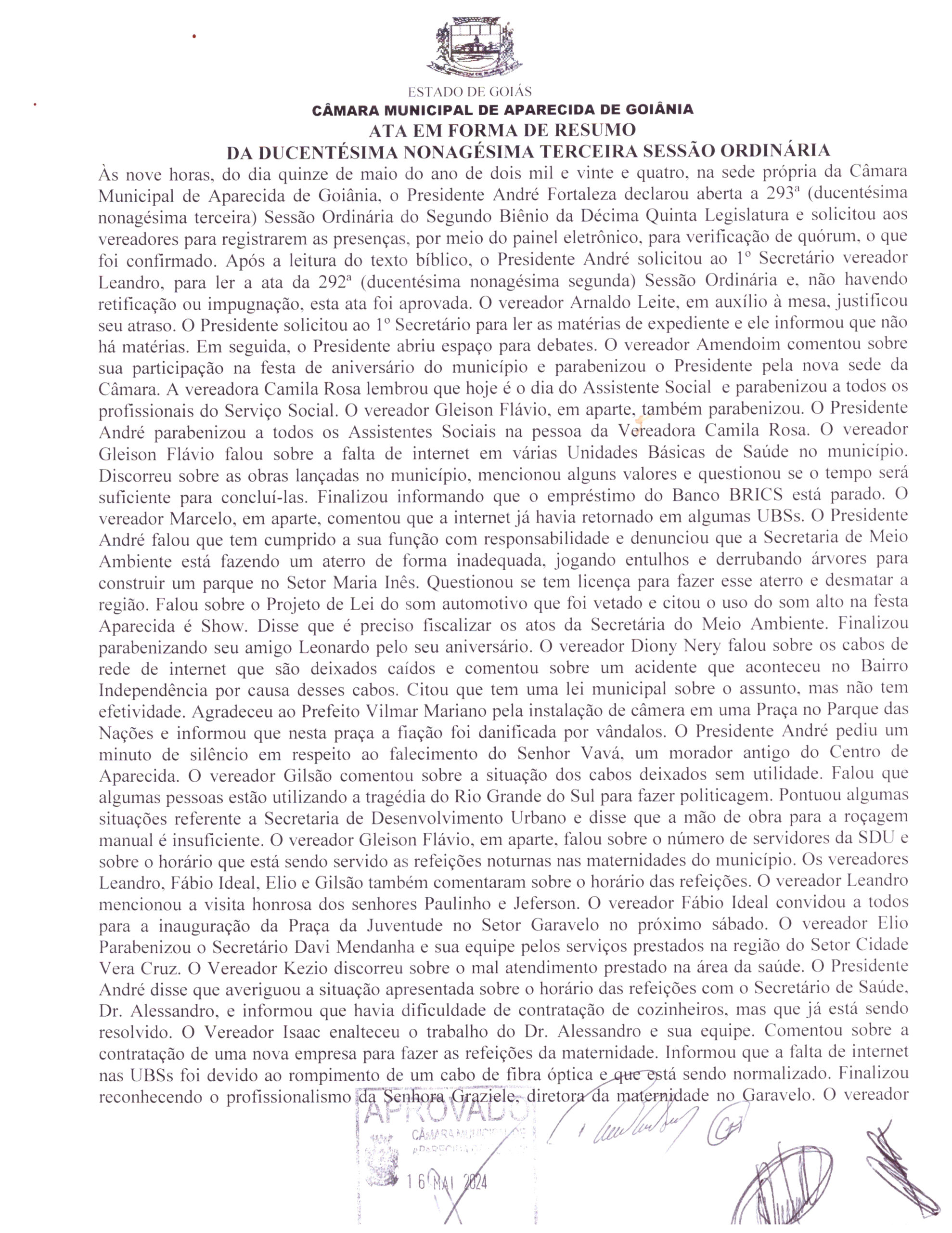 Ata da Ducentésima Nonagésima Terceira Sessão Ordinária