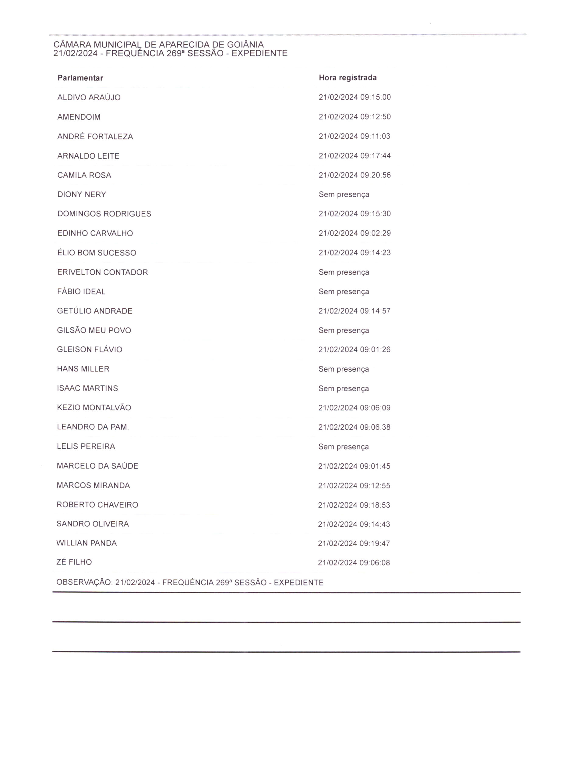 Ata em forma de resumo e frequência: Ata da Ducentésima Sexagésima Nona Sessão Ordinária