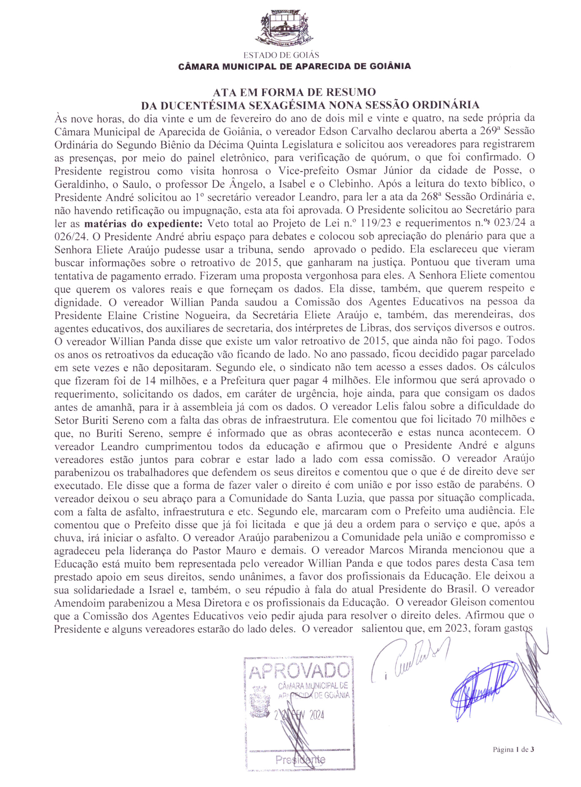 Ata da Ducentésima Sexagésima Nona Sessão Ordinária