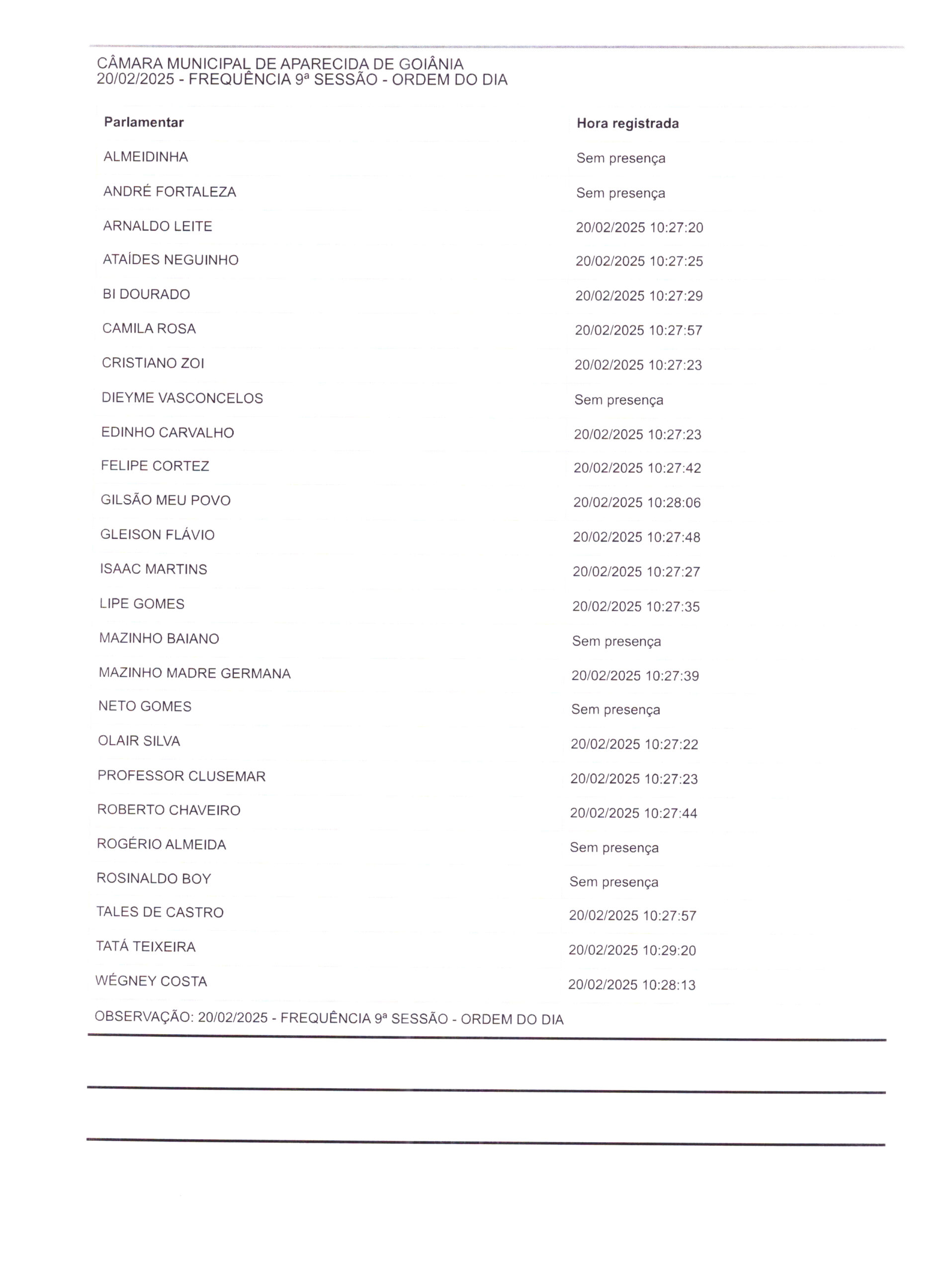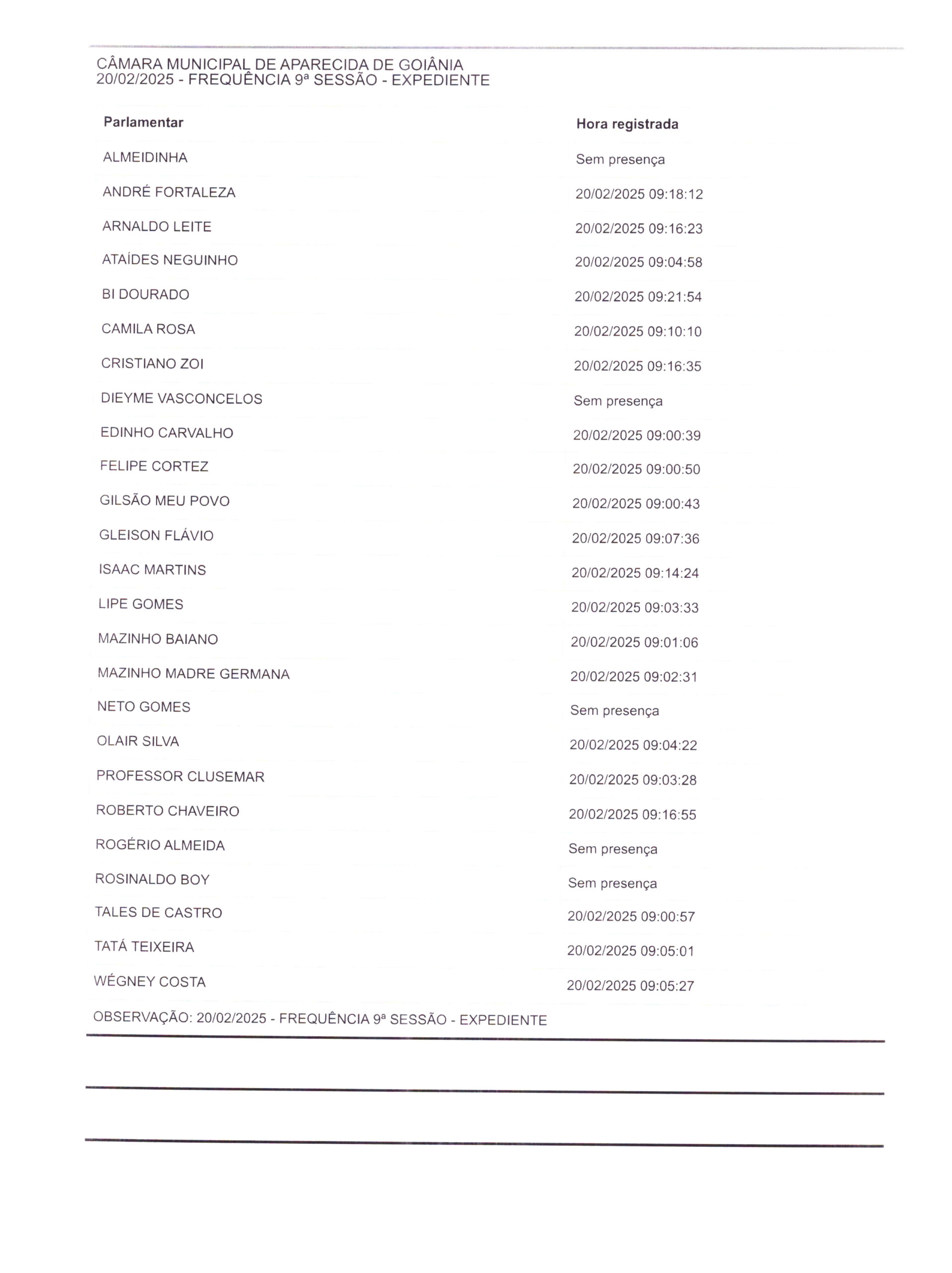 Ata em forma de resumo e frequência: Ata da Nona Sessão Ordinária de 2025