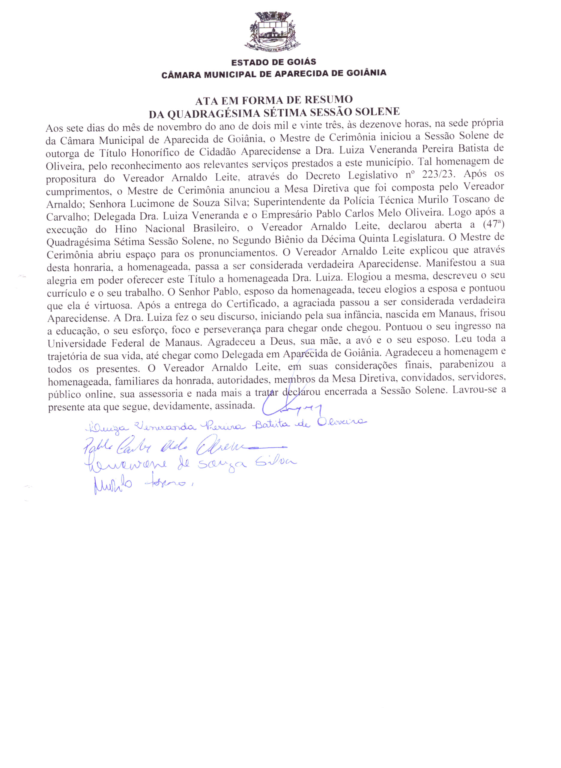 Ata em forma de resumo: Ata da Quadragésima Sétima Sessão Solene