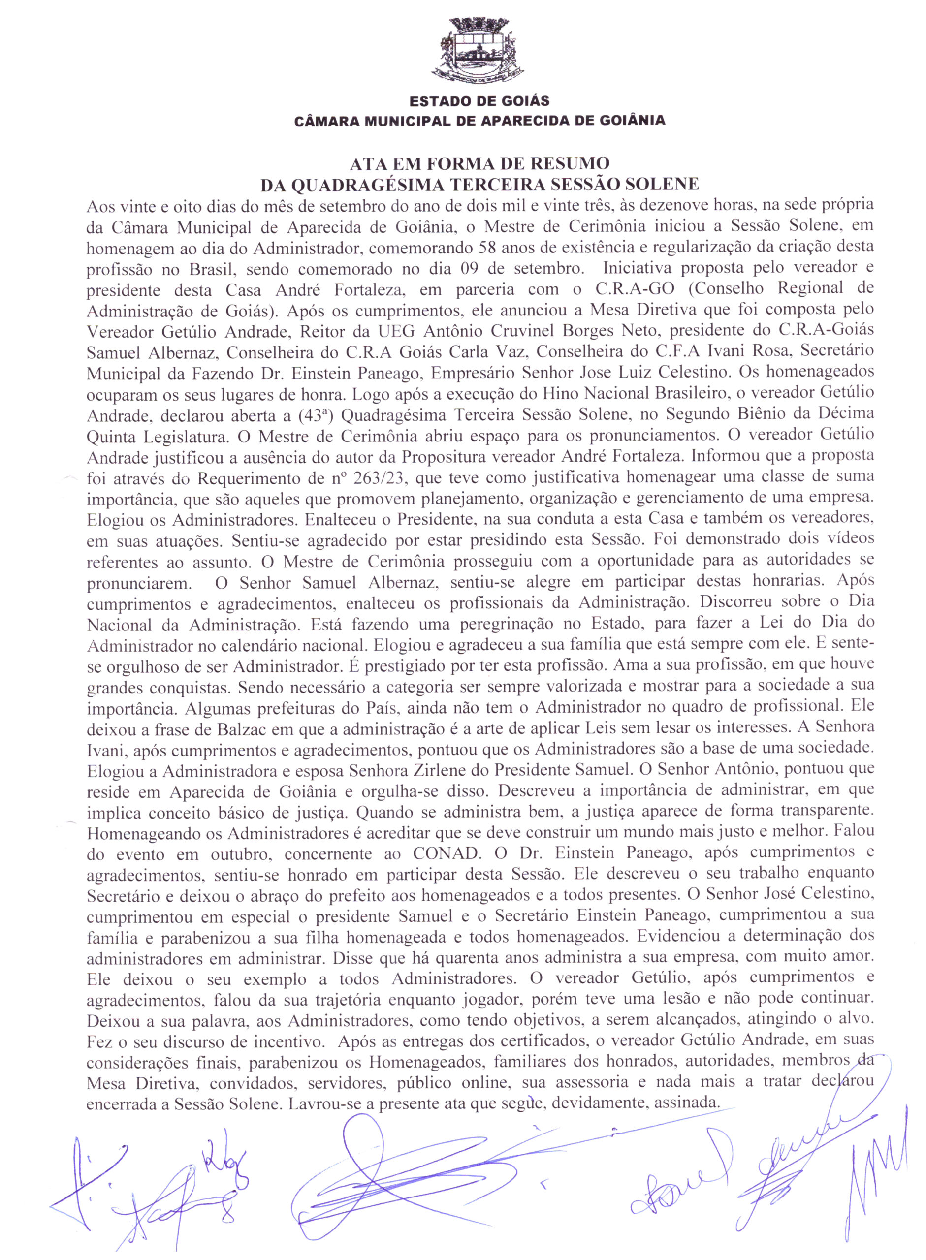 Ata em forma de resumo: Ata da Quadragésima Terceira Sessão Solene