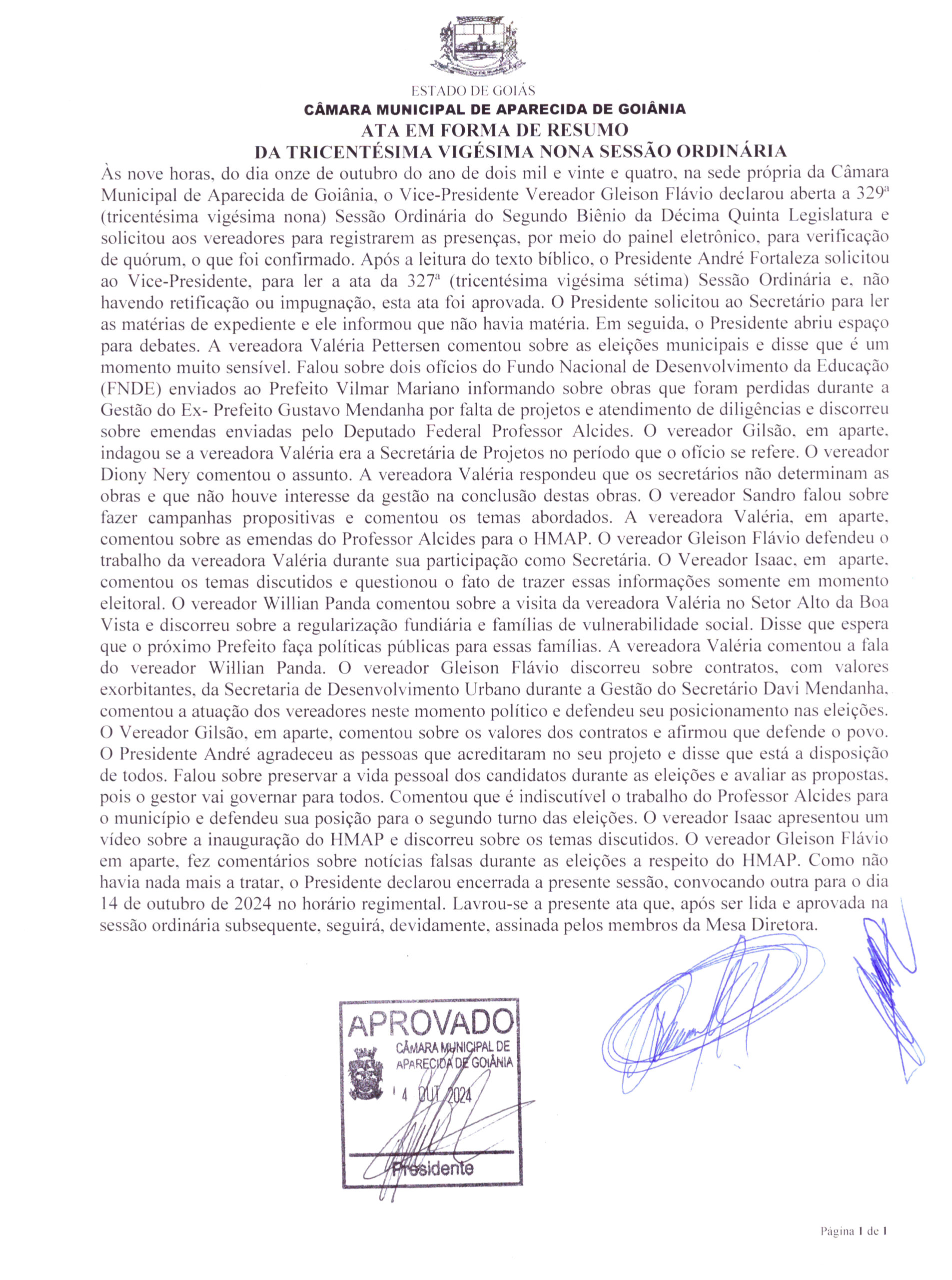 Ata da Trecentésima Vigésima Nona Sessão Ordinária