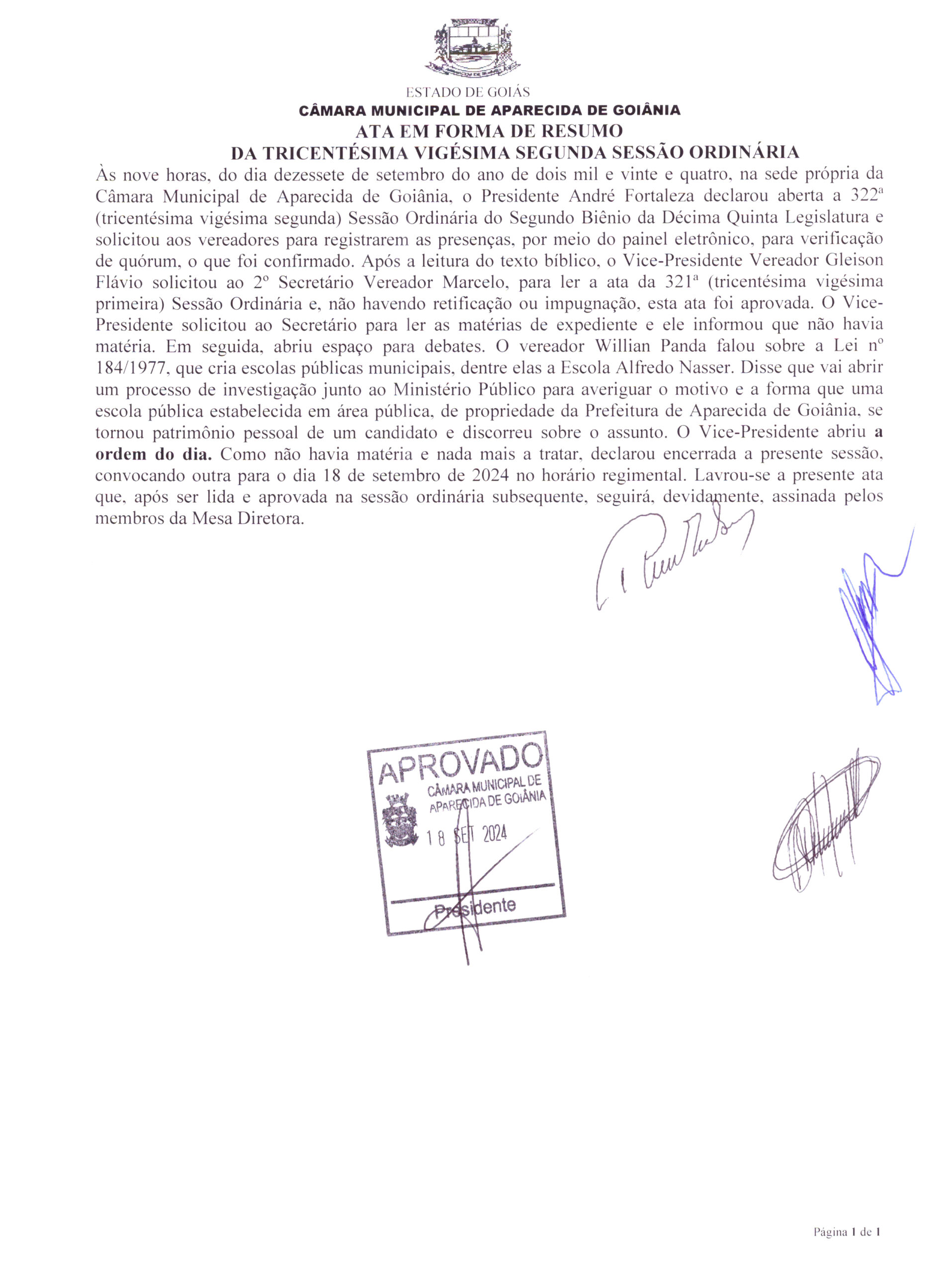 Ata da Trecentésima Vigésima Segunda Sessão Ordinária