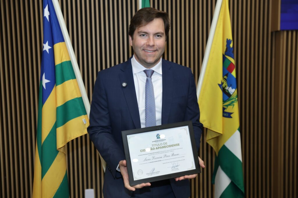 Em seguida, por iniciativa do vereador Neto Gomes, foram entregues dois títulos de Cidadão Aparecidense. O primeiro homenageado foi o vereador por Goiânia Lucas Kitão. Advogado e liderança comunitária nascido em 1991, Kitão é considerado uma das principais referências da nova geração da política goiana. Seu envolvimento com causas sociais começou ainda na adolescência. Aos 15 anos ingressou no movimento estudantil e, em 2016, foi eleito vereador da capital, tornando-se o mais jovem integrante do Legislativo goianiense por três mandatos consecutivos. Em 2025, assumiu vaga como suplente na Câmara dos Deputados.