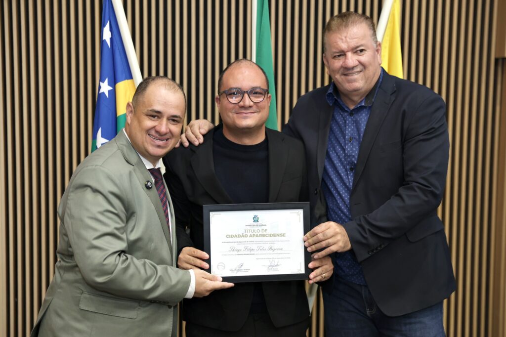 A segunda honraria entregue por Neto Gomes foi destinada a Thiago Filipe Teles Bezerra. O vereador afirmou que a homenagem reconhece a expressiva contribuição de Thiago para o desenvolvimento econômico e social de Aparecida. Empresário dos setores de combustíveis e construção civil, ele tem gerado empregos, fortalecido o mercado local e colaborado com iniciativas sociais.